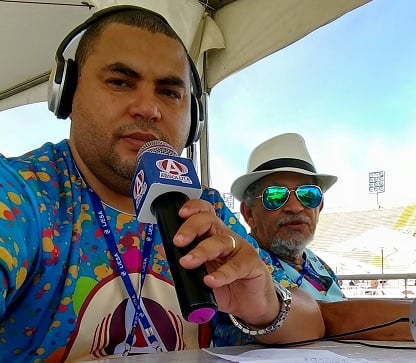 Transmissão esportiva de Brasil 3 x 0 Paraguai, em 29 de março de 2017, na Arena Corinthians, ocasião em que o Brasil se classificou para a Copa do Mundo da Rússia: enquanto Paulo reporta o jogo, um raro sorriso do então narrador André e Antonio Maia, comentarista, entre ambos | Acervo de Família