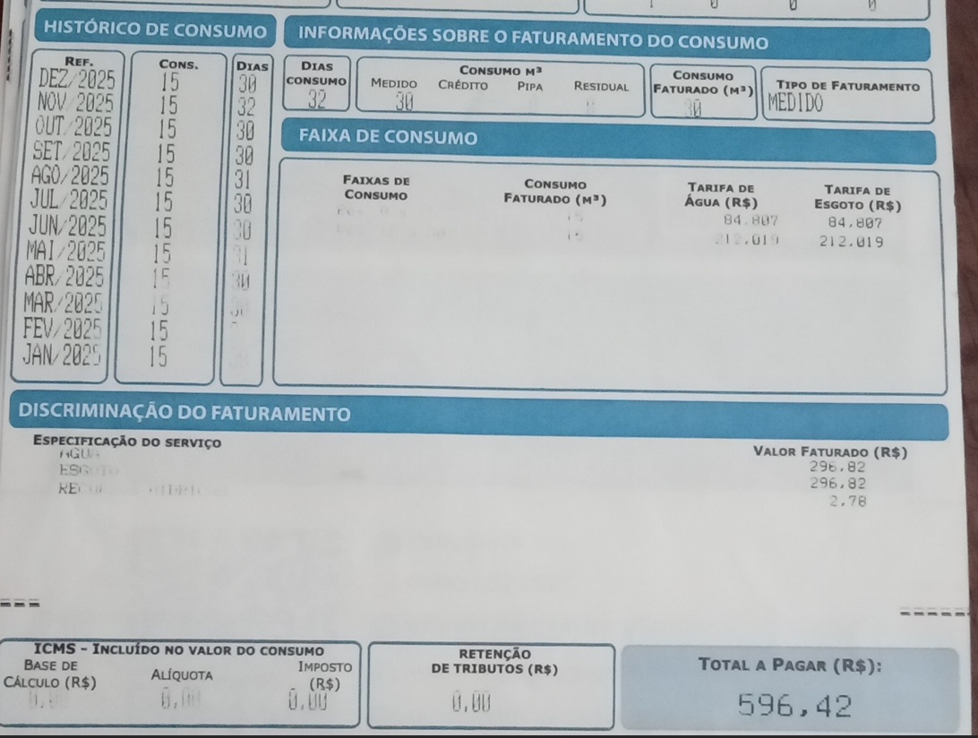 Recebi minha conta de vencimento 18/01/26 no valor de $455.37, sendo um valor de R$251,17 de cobrança pelo serviço de religaçao do hidrometro. Porém acho um absurdo esse valor. Mais caro que a própria conta de água. E em nenhum momento foi-me dito que viria esse valor absurdo”, protesta.