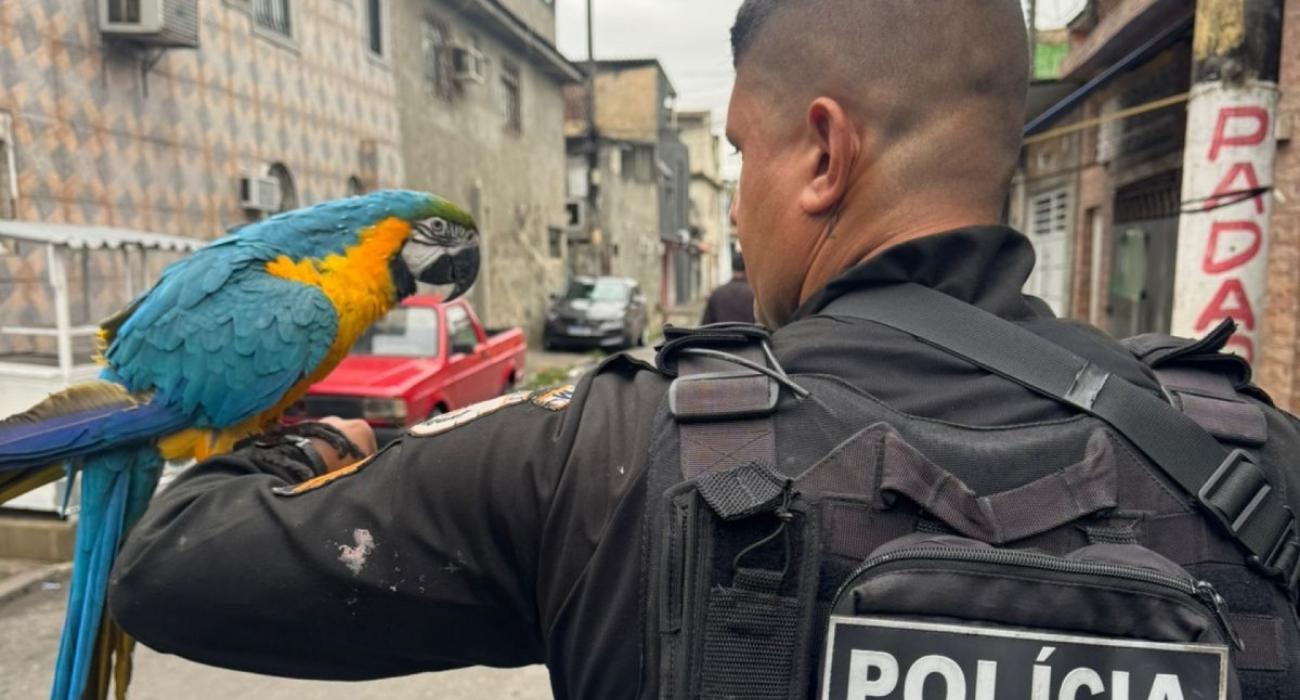 Uma arara-canindé resgatada na Vila Kennedy chamou a atenção durante uma ação policial na Zona Oeste do Rio. Policiais do 14º BPM (Bangu) encontraram a ave presa dentro de uma casa usada por criminosos como ponto de venda de drogas, nesta sexta-feira (19).