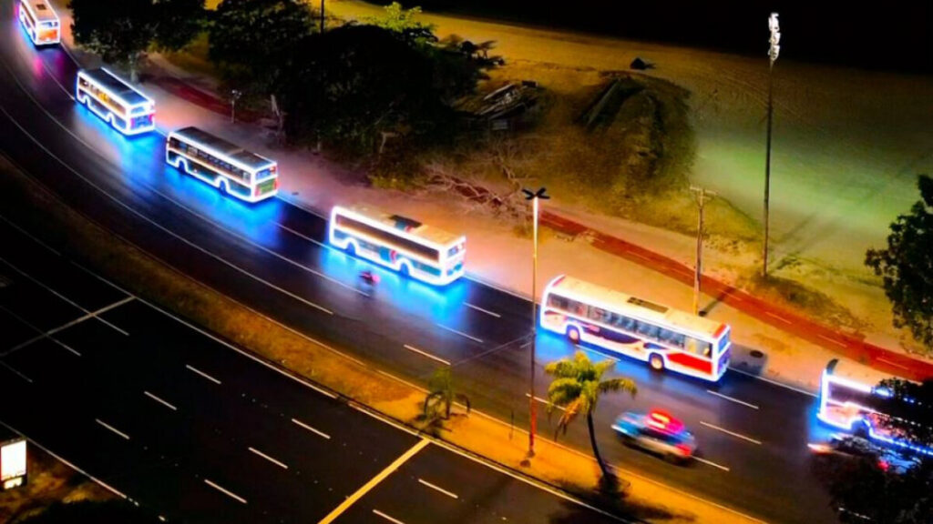 Na sexta-feira, os ônibus partiram às 19h do Terminal Alvorada, na Barra da Tijuca, seguindo até Madureira, na Zona Norte. Nos dois dias seguintes, moradores da Zona Oeste e da Zona Sul também poderão acompanhar o desfile iluminado.
