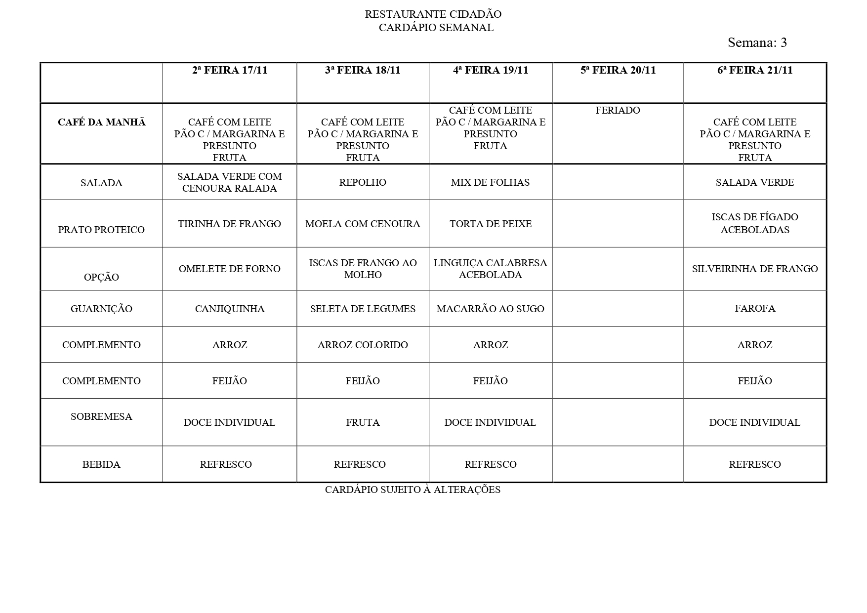 A Prefeitura de Maricá divulgou nesta sexta que o restaurante vai servir café da manhã por R$ 1 e almoço por R$ 2. A tabela semanal inclui pratos variados e pode sofrer alterações, mas mantém foco em comida equilibrada, nutritiva e adequada ao público que circula diariamente pela unidade.
