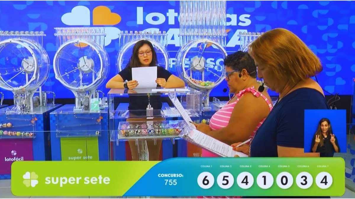 Ao final do sorteio, funcionária das Loterias da Caixa confere juntamente com as auditoras do público o resultado do concurso 755 da Super Sete, para confirmação das dezenas sorteadas | Reprodução/Youtube/Loterias Caixa Econômica Federal