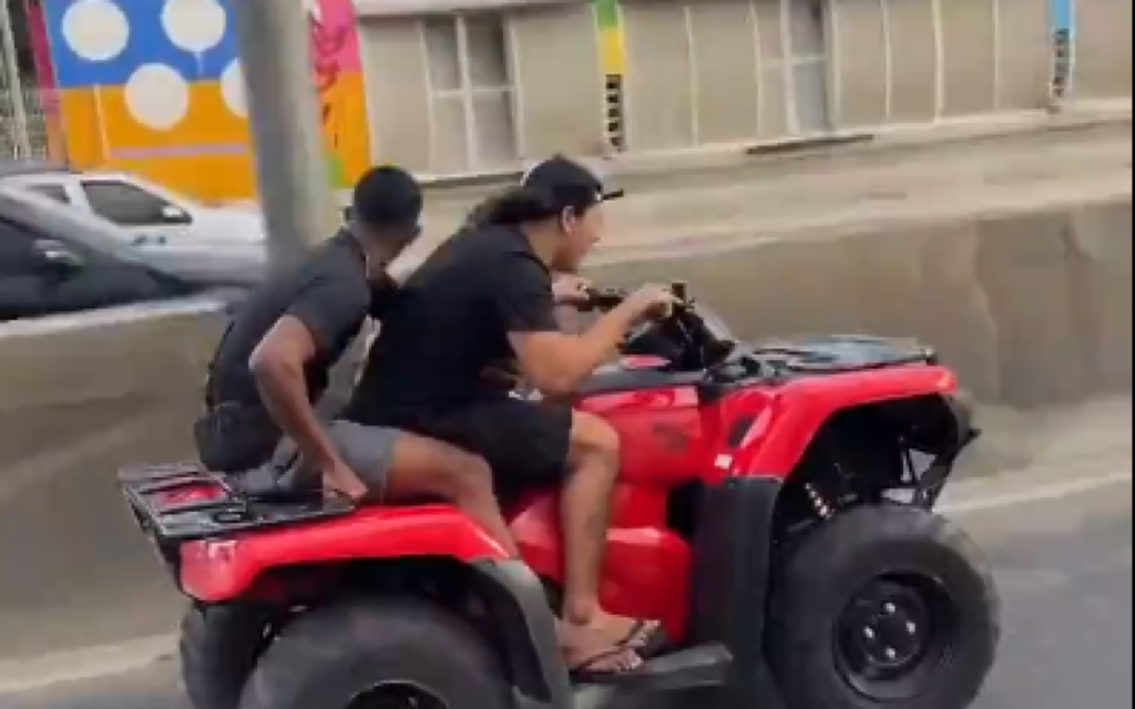 Dois homens foram flagrados em um quadriciclo em alta velocidade, na Avenida Brasil, altura de Vigário Geral.