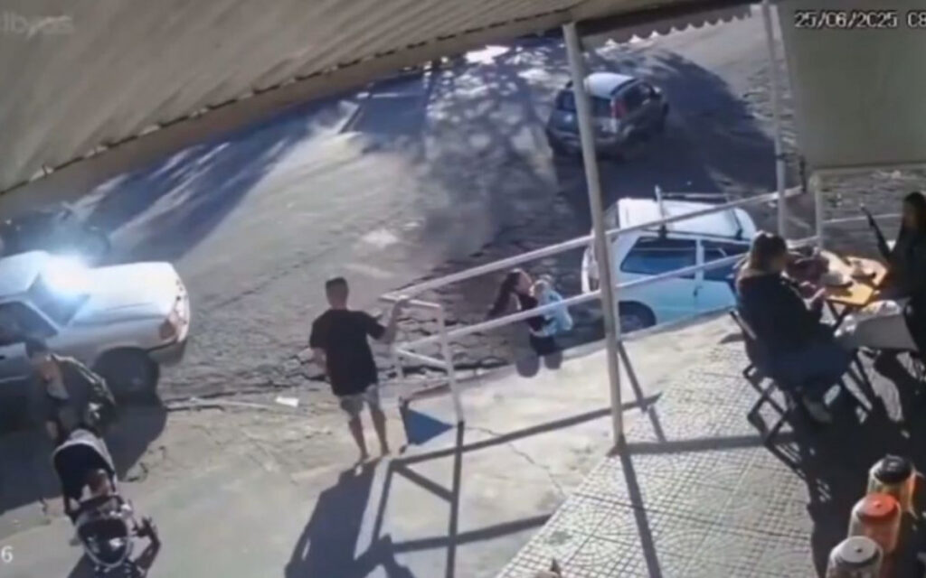 A caminhonete ainda se move por alguns metros após os tiros, mas colide com um muro logo em seguida. O ataque ocorreu em uma rua cheia, em horário de movimento, com pedestres ao redor — entre eles, duas mulheres com carrinhos de bebê.