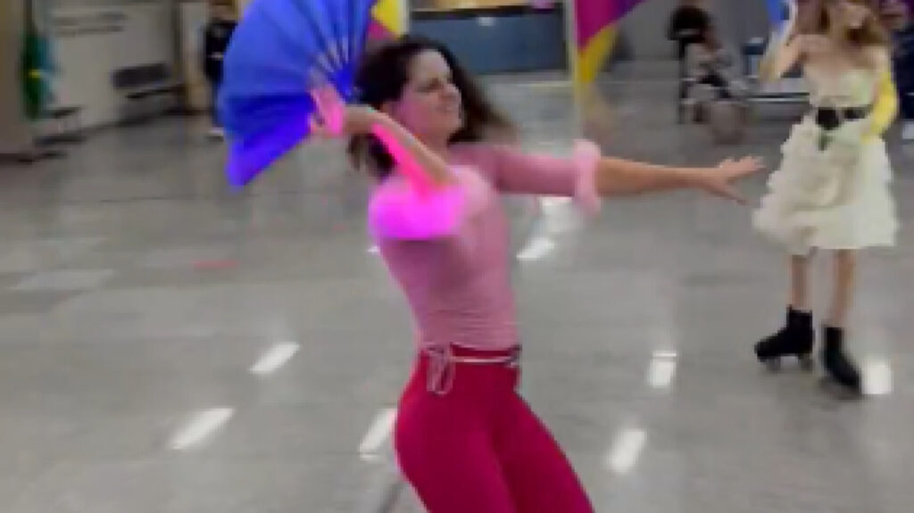 Vestidos com roupas coloridas e adornados com leques, os fãs entoaram hits da artista enquanto patinavam pelas áreas do aeroporto.