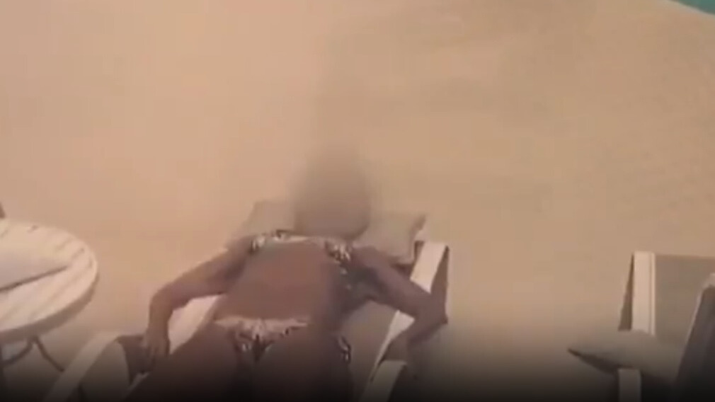 Em uma gravação capturada por uma câmera de segurança, é possível observar a mulher deitada em uma espreguiçadeira na área da piscina.