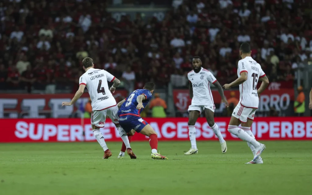 A disputa começou com o Bahia tomando a iniciativa, controlando a posse de bola e pressionando a defesa carioca. Nos acréscimos do primeiro tempo, o Esquadrão intensificou o ataque e chegou a ameaçar o gol defendido por Matheus Cunha, mas o Flamengo resistiu bravamente, bloqueando todas as tentativas.