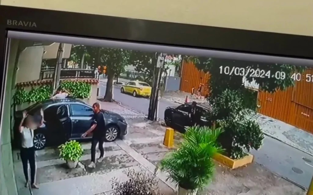 Segundos depois, o carro volta de ré e três homens armados rendem o motorista e a assessora. A mulher, que estava no banco de trás, sai do carro com as mãos para cima, assim como o motorista. Em seguida, os bandidos entram no veículo e fogem.