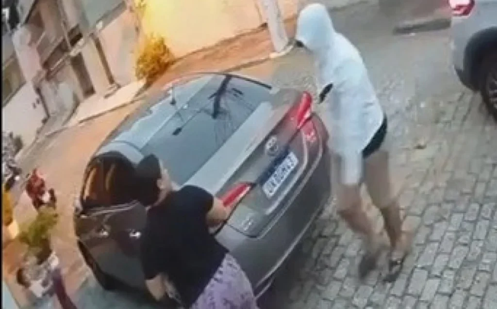 Sendo assim, o vídeo, que circula nas redes sociais, mostra o momento em que um dos bandidos se aproxima da mulher, que estava retirando bolsas do porta-malas do carro.