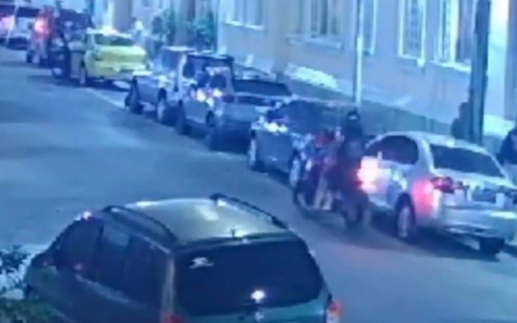Câmeras de segurança de um prédio registraram a ação criminosa, que ocorreu rapidamente. O suspeito abordou as vítimas e fugiu em seguida.