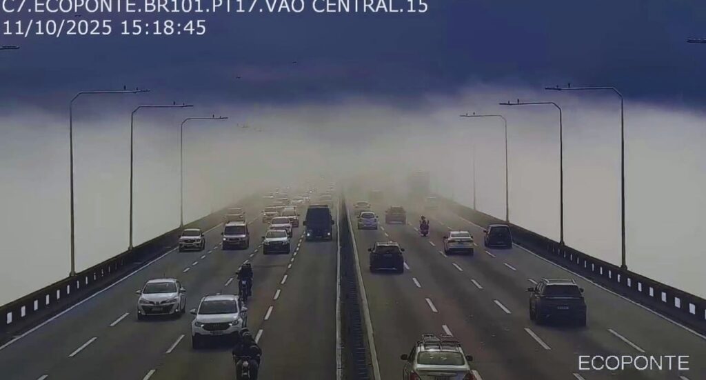 Um forte nevoeiro na Ponte Rio-Niterói transformou a paisagem neste sábado (11), criando um cenário misterioso e exigindo atenção redobrada dos motoristas que cruzavam a Baía de Guanabara.