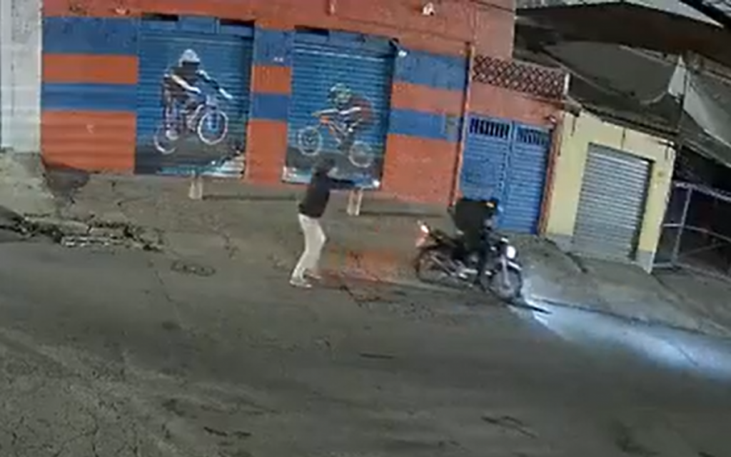 Imagens de câmeras de segurança mostram o momento em que o homem, em uma motocicleta, aborda o policial e aponta uma arma. O PM estava sentado em uma cadeira na calçada quando foi surpreendido.