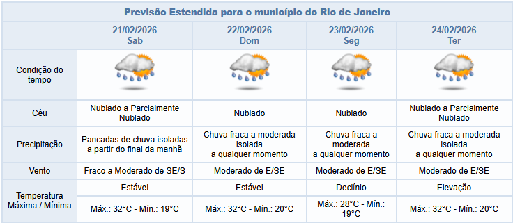 Para os próximos dias, o cenário indica tempo instável e chuva recorrente. No sábado, a frente fria avança pelo litoral fluminense e provoca chuva fraca na madrugada e na manhã, com pancadas a partir do fim da manhã. Os ventos permanecem moderados.