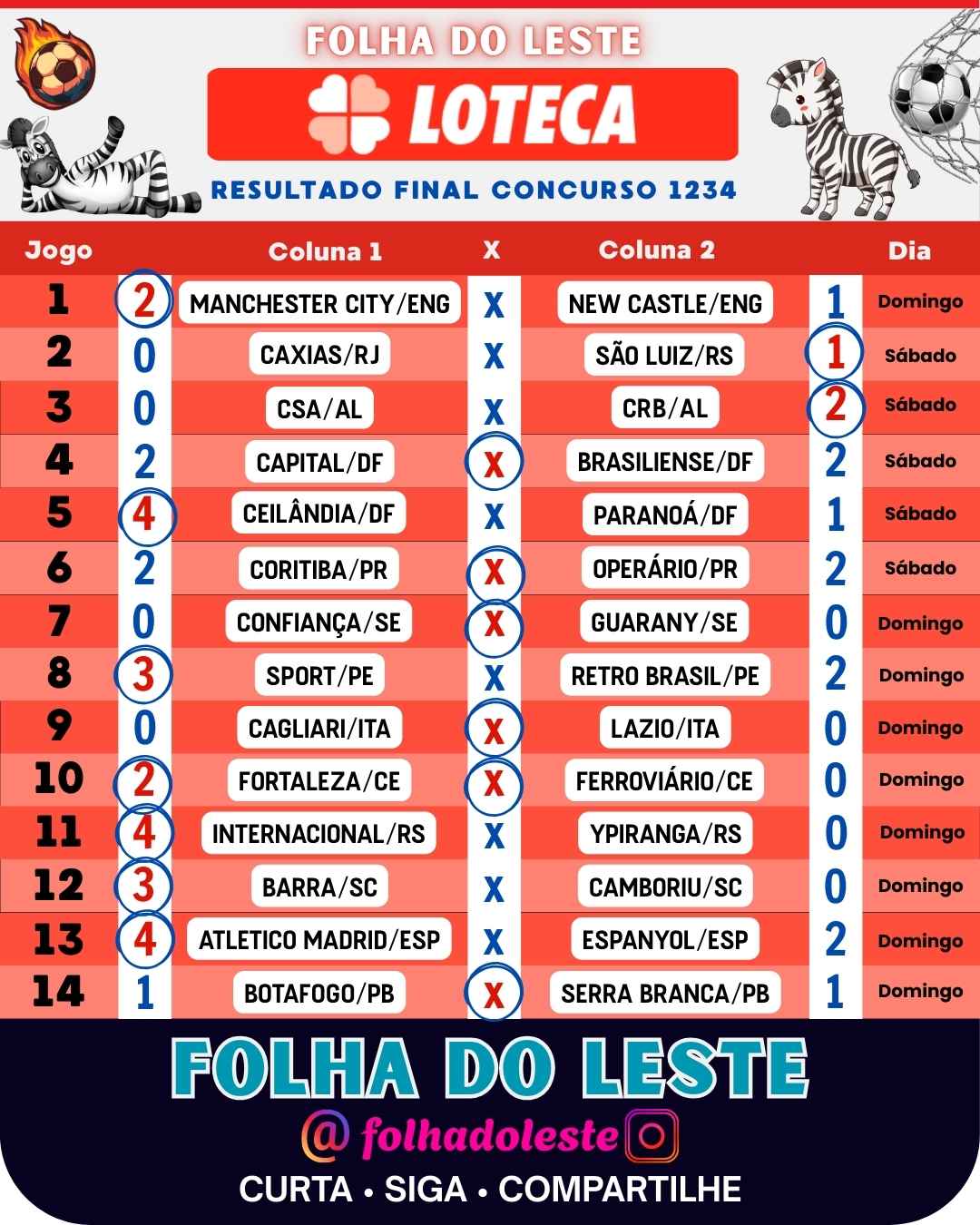 Jogos, detalhes e placares da Loteca 1234