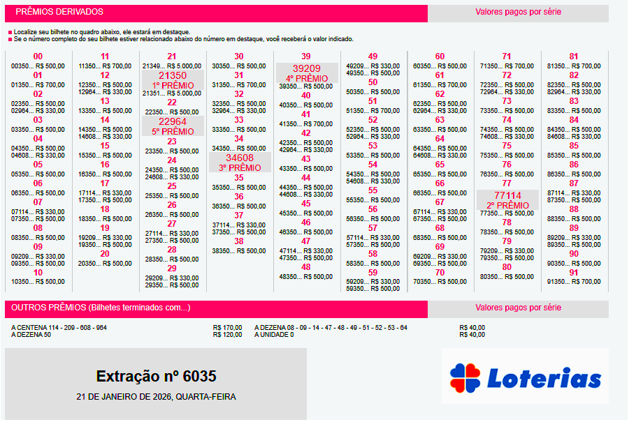 Vale ressaltar que bilhetes próximos ao primeiro prêmio na série 21 receberão premiação de R$ 5.000,00: caso das dezenas de milhar 21349; e 21351.