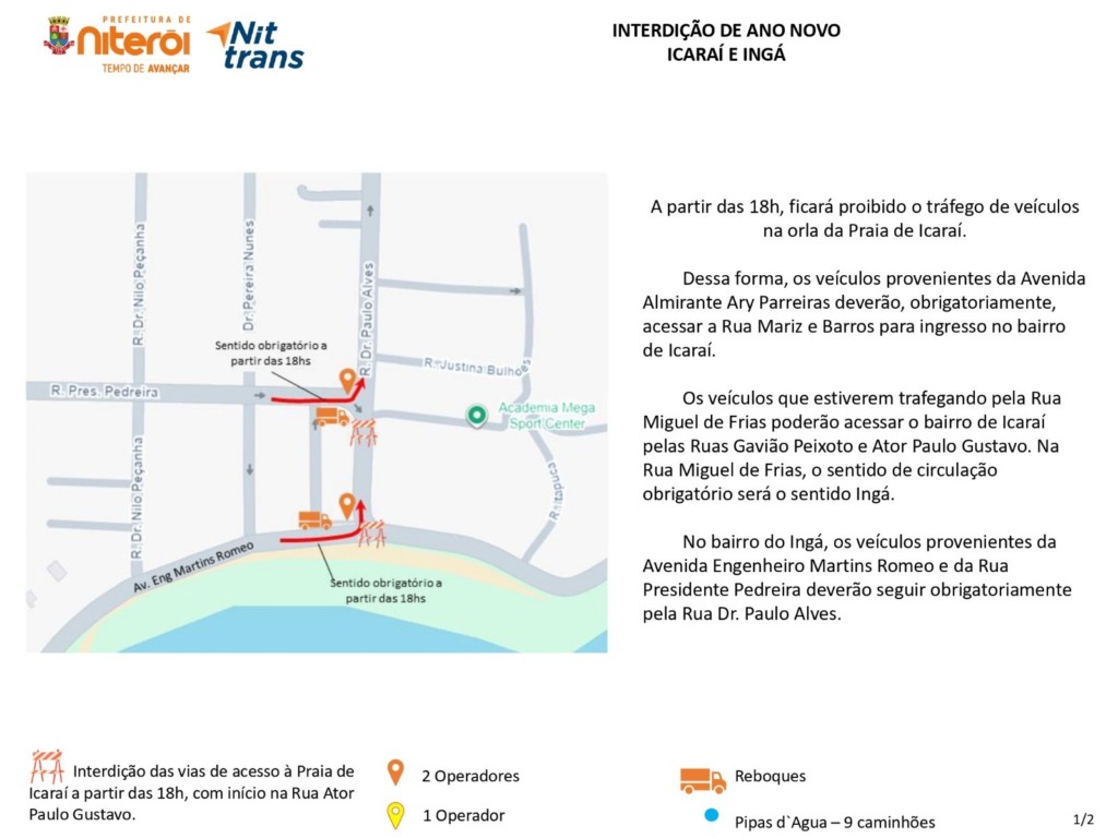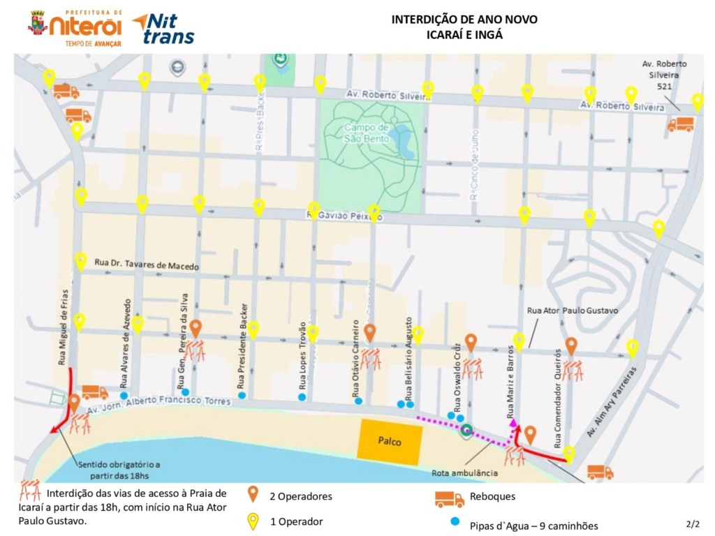 A Prefeitura de Niterói montou um esquema especial de trânsito para a noite de Réveillon. A principal medida será a interdição total da orla da Praia de Icaraí, principal ponto de concentração do público.