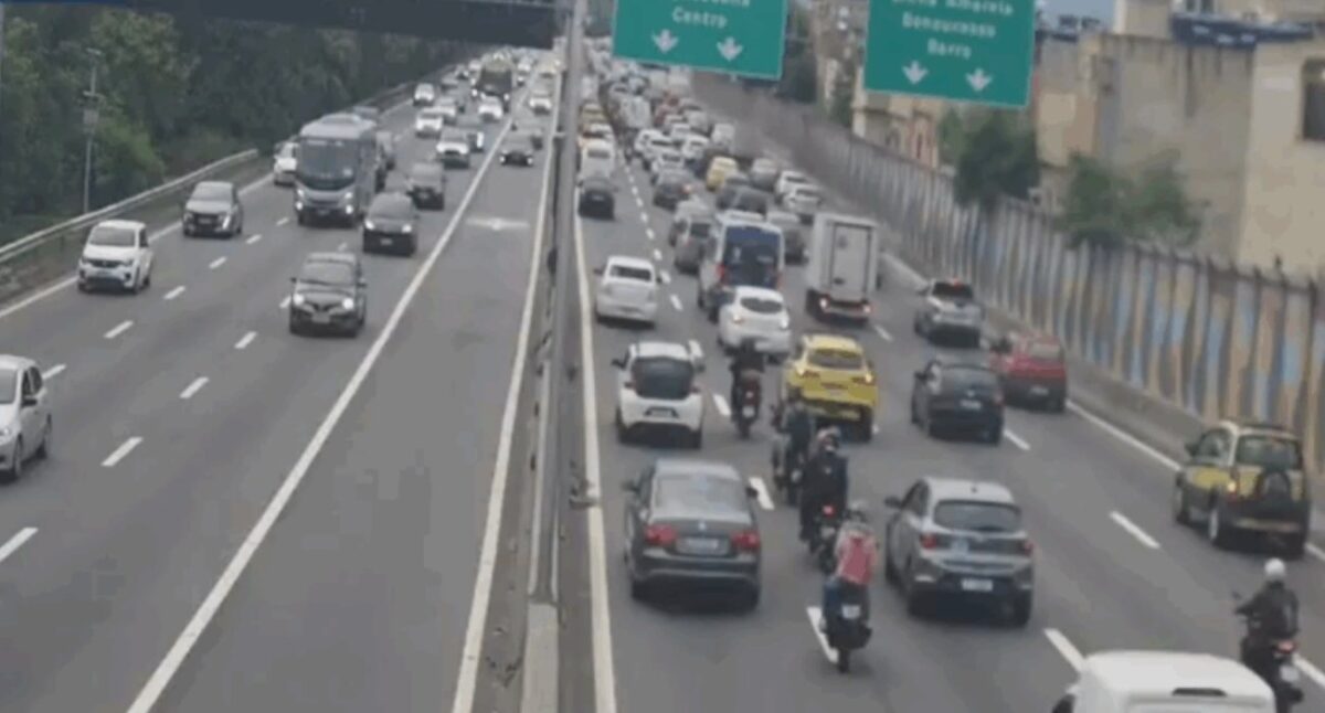 O trecho próximo à Washington Luiz está lento. Em direção ao Fundão, o fluxo segue estável. Entre a Maré e São Cristóvão, motoristas enfrentam tráfego pesado e pontos de retenção.