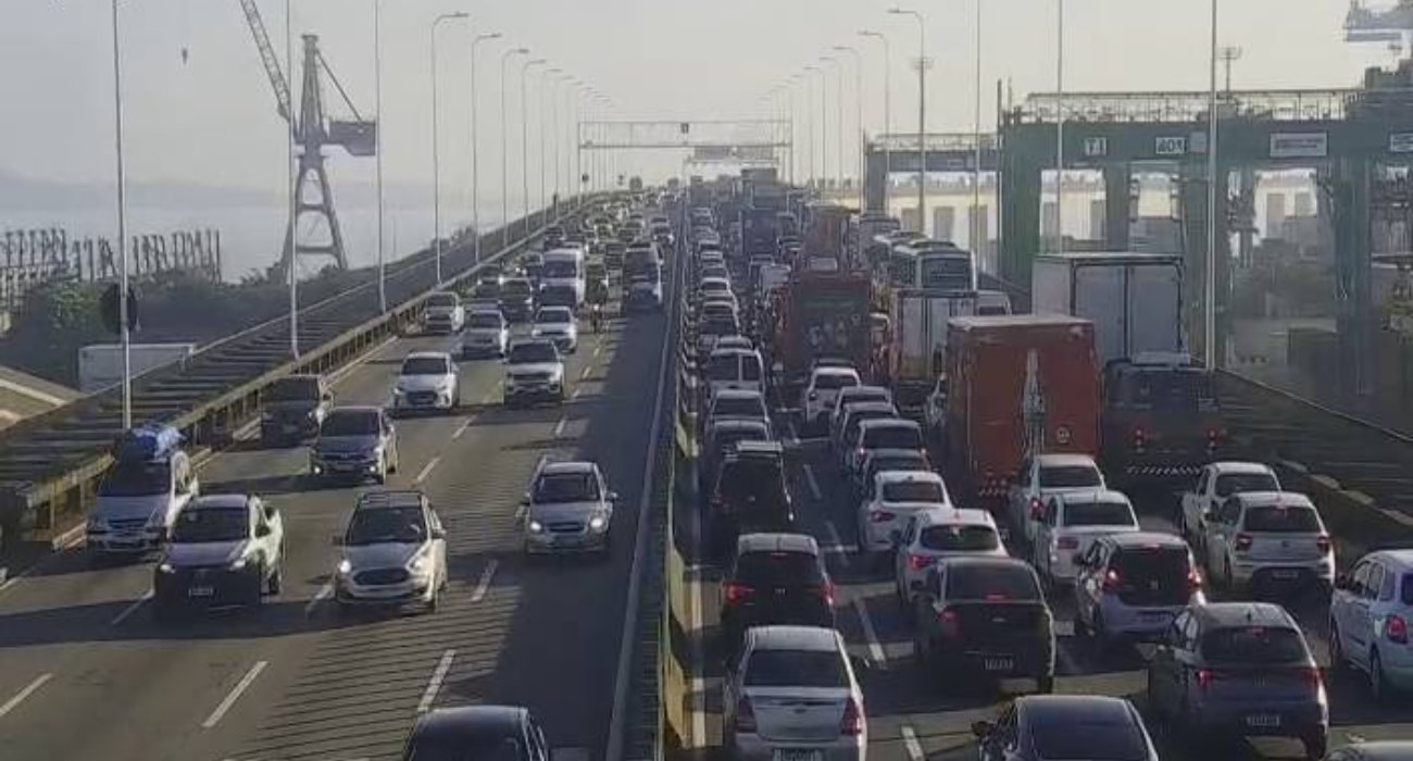 O trânsito na Ponte Rio-Niterói registrou lentidão na manhã desta quarta-feira (12) após uma colisão no Vão Central, que chegou a interditar três faixas no sentido Niterói. Segundo a Ecovias, o tempo de travessia ultrapassou 30 minutos, mais que o dobro do habitual.