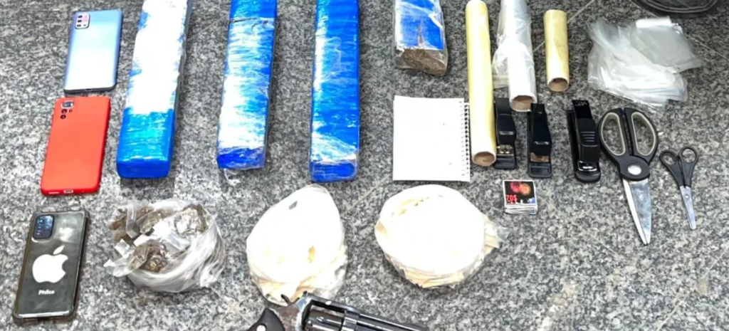 Durante a revista, foram encontrados um revólver Taurus calibre 38, seis munições, cerca de 3,5 kg de maconha divididos em quatro tabletes, 245 sacolés de cocaína, 19 trouxinhas de maconha, três celulares e materiais para embalar as drogas.