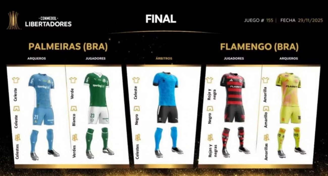 A Conmebol confirmou os uniformes de Flamengo e Palmeiras para a grande final da Libertadores da América, marcada para o dia 29 de novembro, em Lima, no Peru. As equipes poderão entrar em campo com suas combinações principais, atendendo ao pedido dos clubes.
